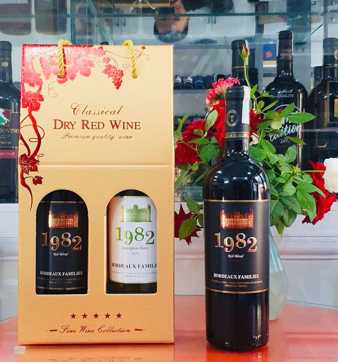 Kết hợp những chai rượu vang 1982 . Hộp quà gồm chai vang trắng Sauvignon Blanc và chai vang đỏ 1982 Cabernet Franc. Đây là cặp sản phẩm chất lượng có thể làm quà biếu hoặc sử dụng cho dịp lễ Tết.