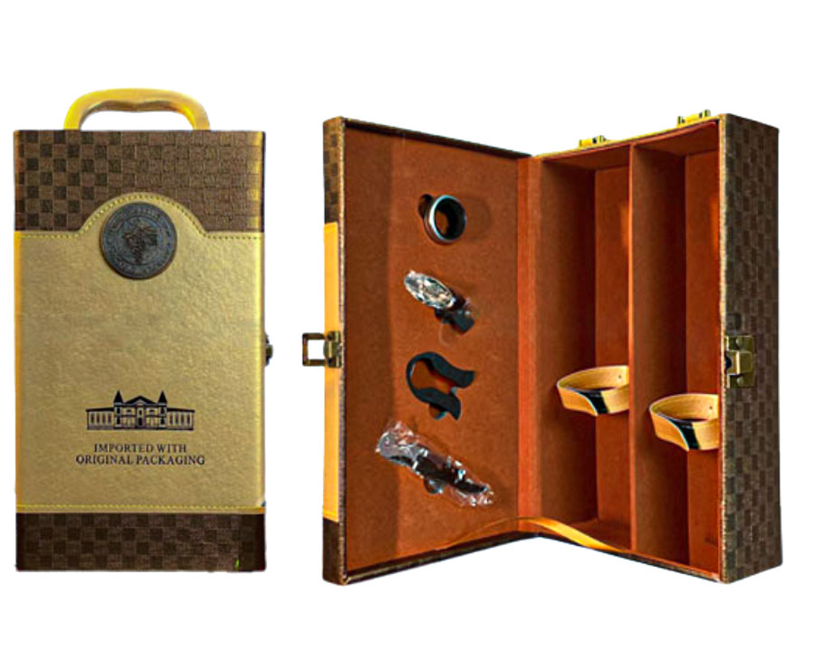 Hộp đựng Rượu Vang bằng Da loại 2 chai ( màu nâu + vàng)