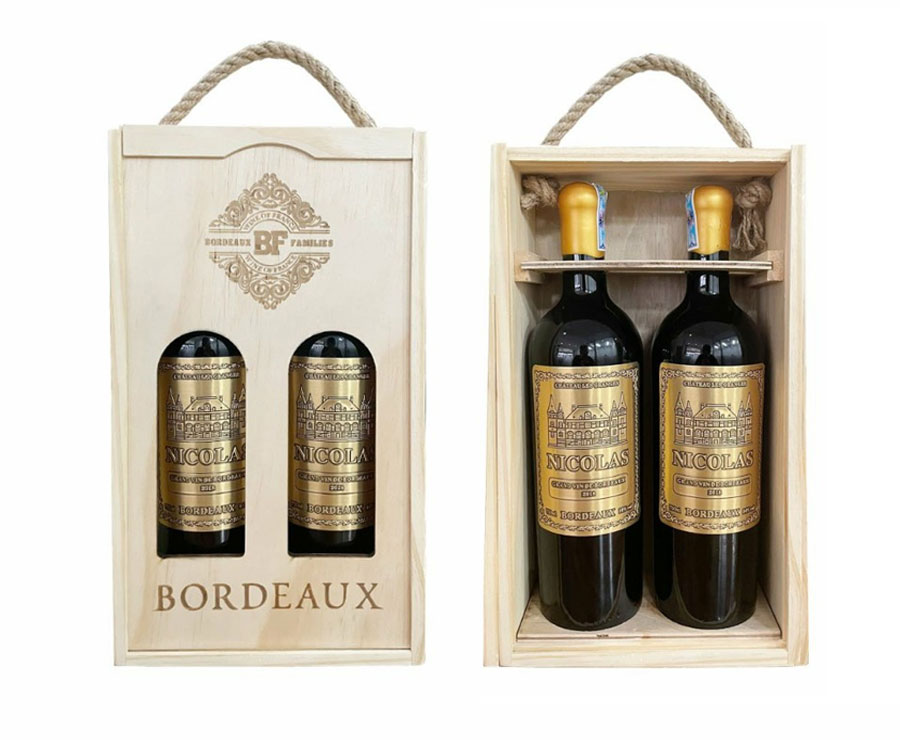 Hộp gỗ 2 chai rượu vang Pháp Nicolas Bordeaux