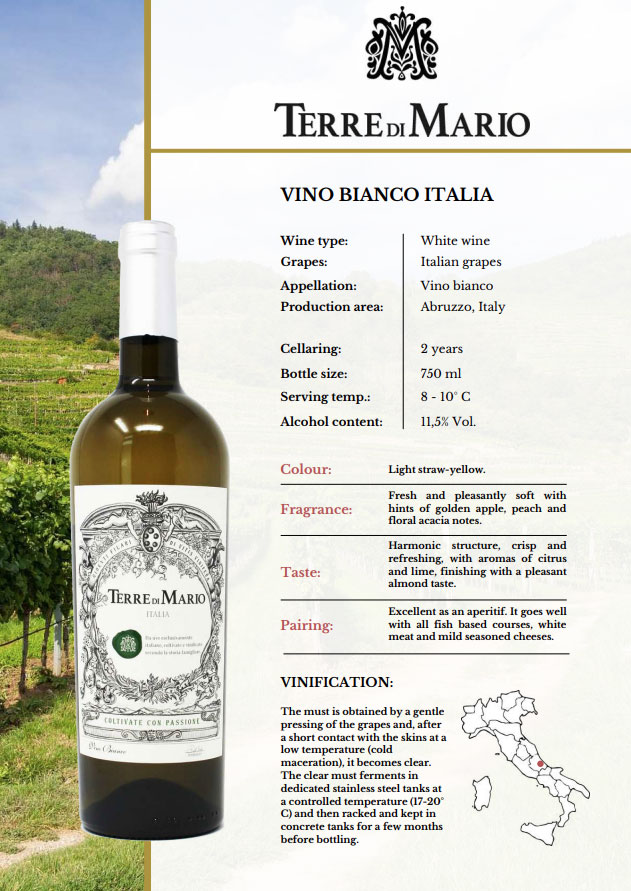 Rượu Vang Ý Terre di Mario Bianco là dòng vang trắng đến từ vùng Abruzzo – một trong những khu vực sở hữu khí hậu ôn hòa và điều kiện tự nhiên lý tưởng của nước Ý. Rượu được làm từ các giống nho trắng bản địa, thu hoạch và chọn lọc kỹ lưỡng trước khi đưa vào quy trình ép nhẹ nhằm giữ trọn sự tinh khiết của trái nho.