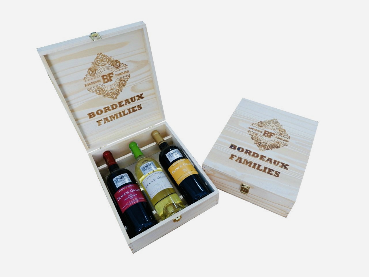 - Quy cách đóng hộp quà tặng: Hộp gỗ 3 chai/phần + túi đựng