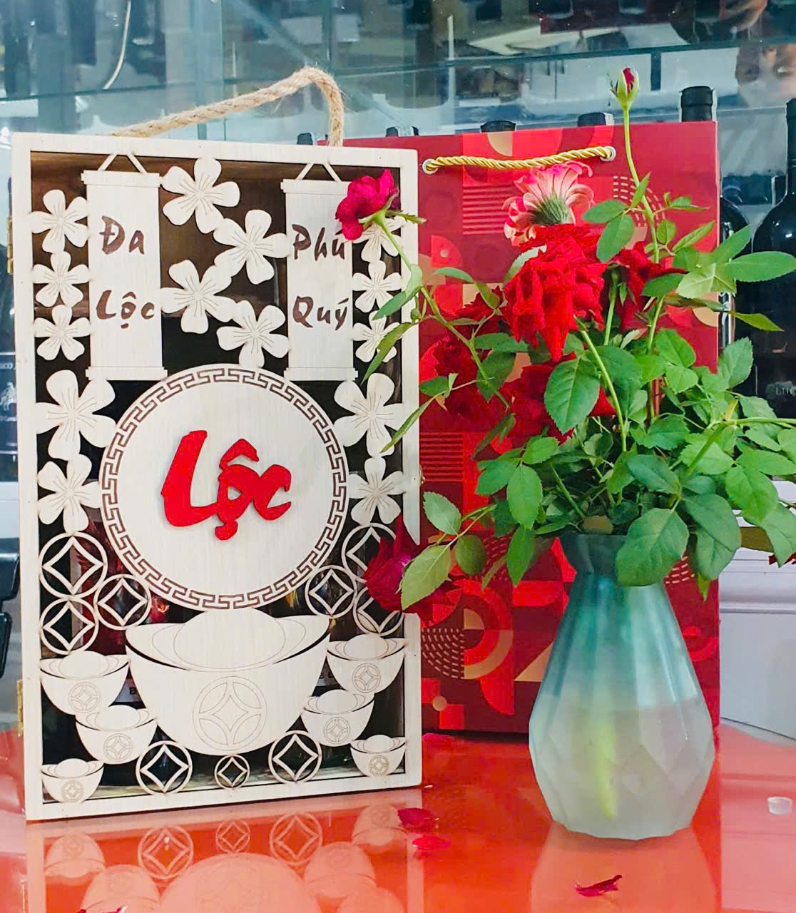 Hộp phù hợp với hầu hết các dòng rượu vang 750ml. Thiết kế chạm khắc hoa văn và biểu tượng chữ Lộc mang ý nghĩa may mắn, tài lộc, kết hợp cùng 2 chai rượu vang tạo nên set quà tặng sang trọng, độc đáo và ý nghĩa, thích hợp cho các dịp biếu tặng, lễ Tết, tri ân khách hàng hoặc đối tác.