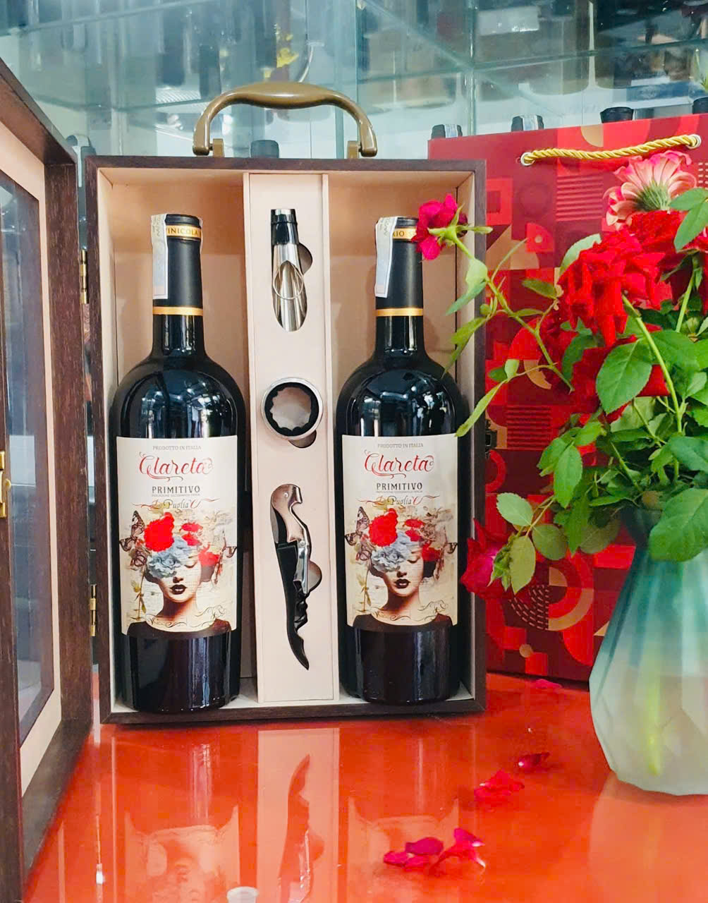Hộp quà Hộp Gỗ Mặt Kính 2 chai Vang Ý CLARETA