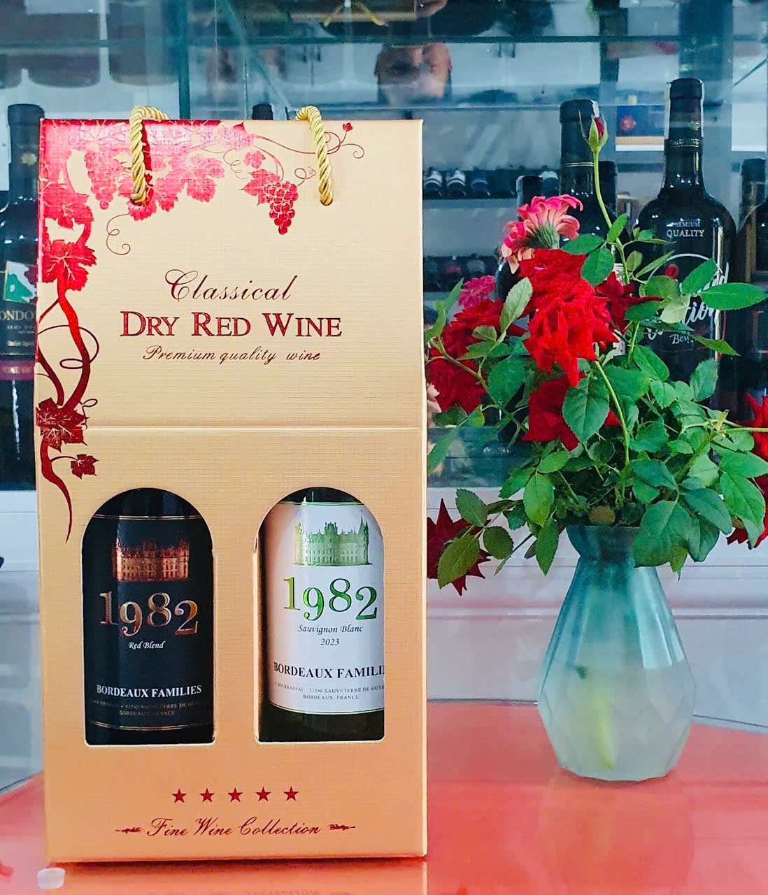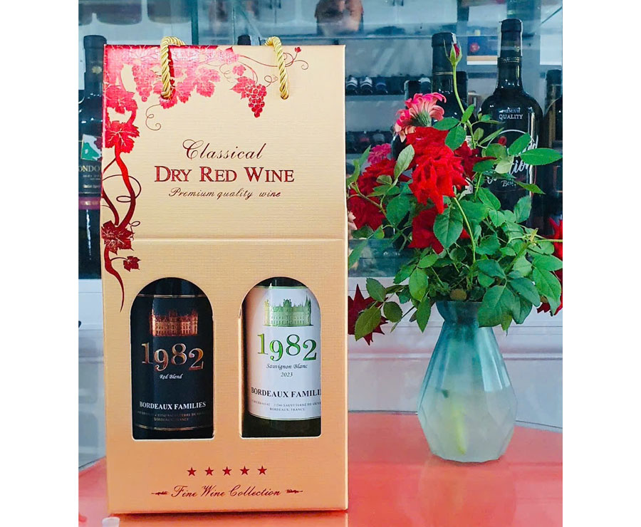 Kết hợp những chai rượu vang 1982 . Hộp quà gồm chai vang trắng Sauvignon Blanc và chai vang đỏ 1982 Cabernet Franc. Đây là cặp sản phẩm chất lượng có thể làm quà biếu hoặc sử dụng cho dịp lễ Tết.